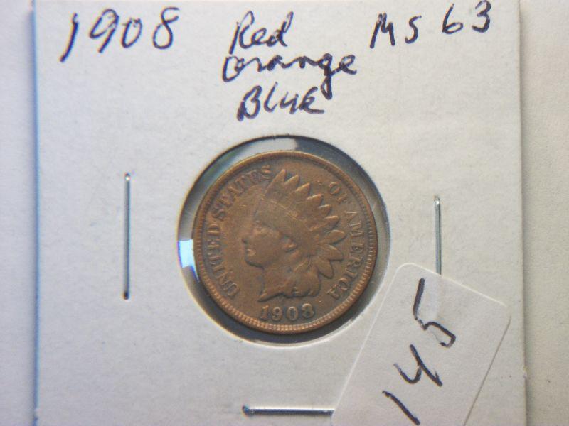 1908 MS-63 RED, ORANGE, AND BLUE INDIAN HEAD CENT
