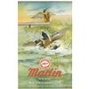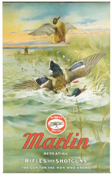 1908 Marlin Repeating Rifles and Shotguns Poster. Depicting duck hunters by artist G. Muss. Arnolt. Original bands, top and bottom. Framed under glass, near mint condition. 15 X 24 inches.