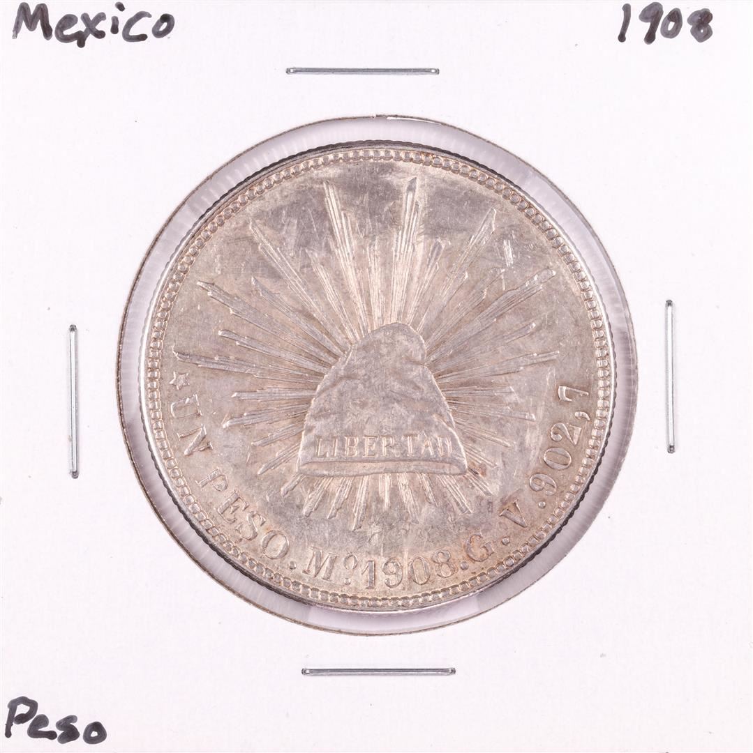 One 1908 Mexico Un Peso Silver Coin.