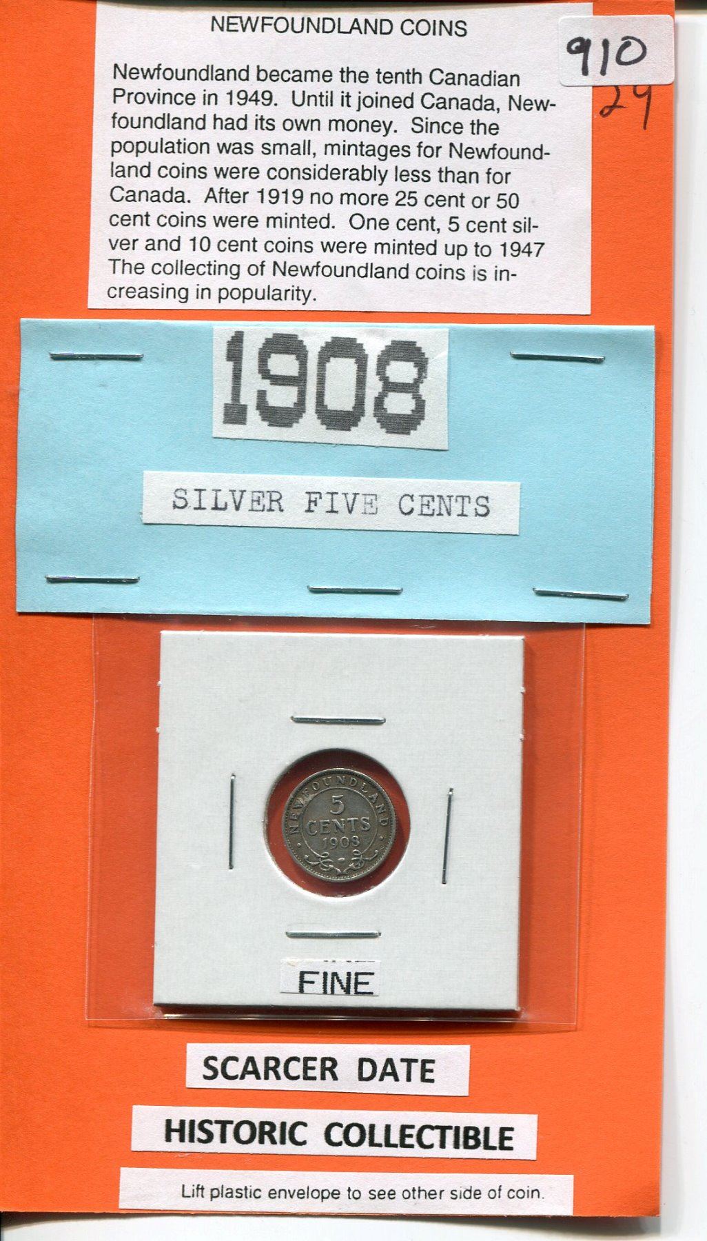 1908 NEWFOUNDLAND SILVER 5 CENTS, SCARCER DATE.