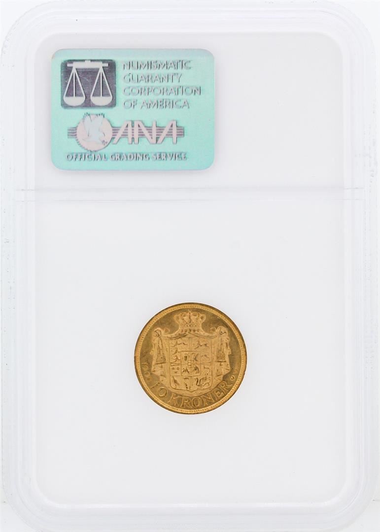 One 1908 NGC MS64 Denmark 10K Gold Coin. NGC Certified.