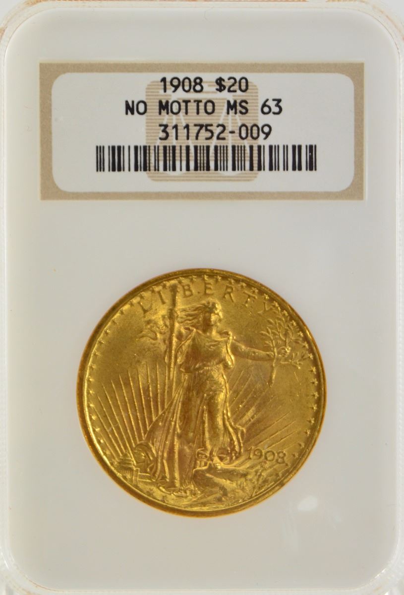 1908 No Motto NGC MS63 Saint Gauden $20 Gold Coin