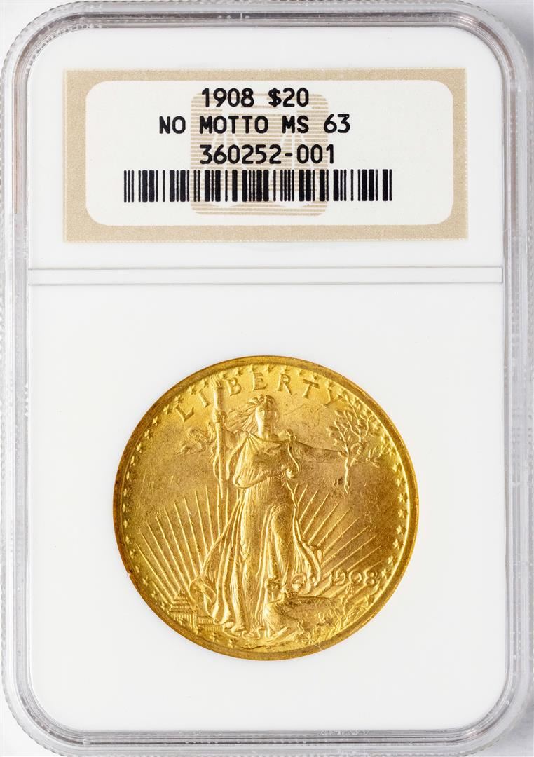 One 1908 NM $20 St. Gaudens Double Eagle Gold Coin NGC MS63. NGC Certified.