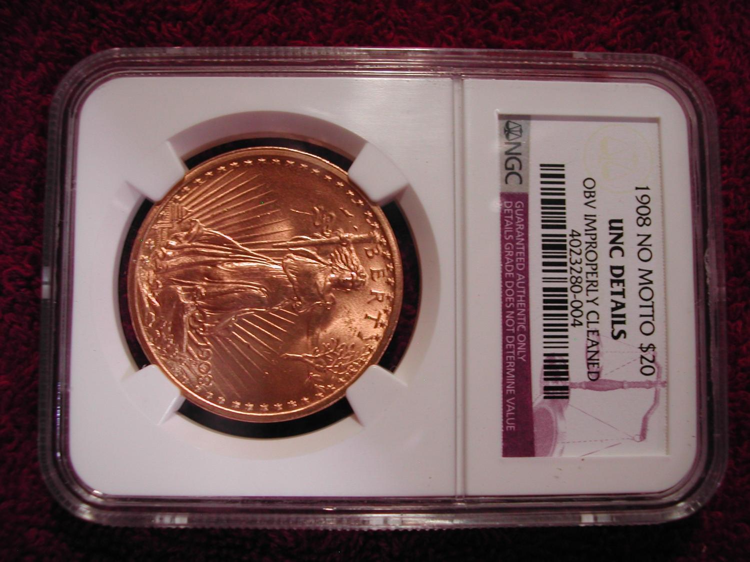 1908 NO MOTTO $20 ST GAUDENS UNC DETAILS, OBV, IMPROPERLY CLEANED