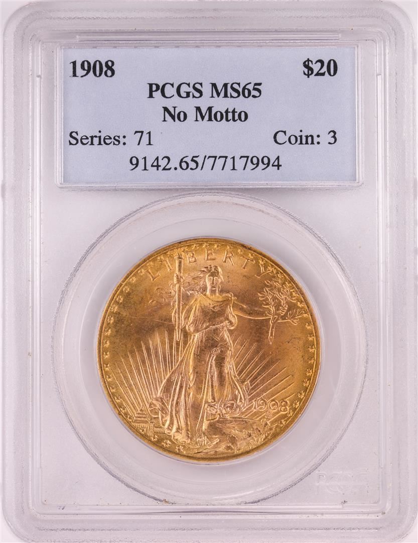 One 1908 NO MOTTO $20 St. Gaudens Double Eagle Gold Coin PCGS MS65.