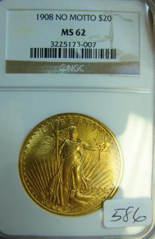 1908 No Motto $20.00 St. Gaudens Gold Coin NGC MS 62