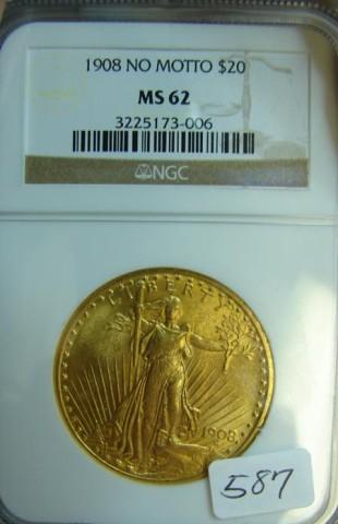 1908 No Motto $20.00 St. Gaudens Gold Coin NGC MS 62