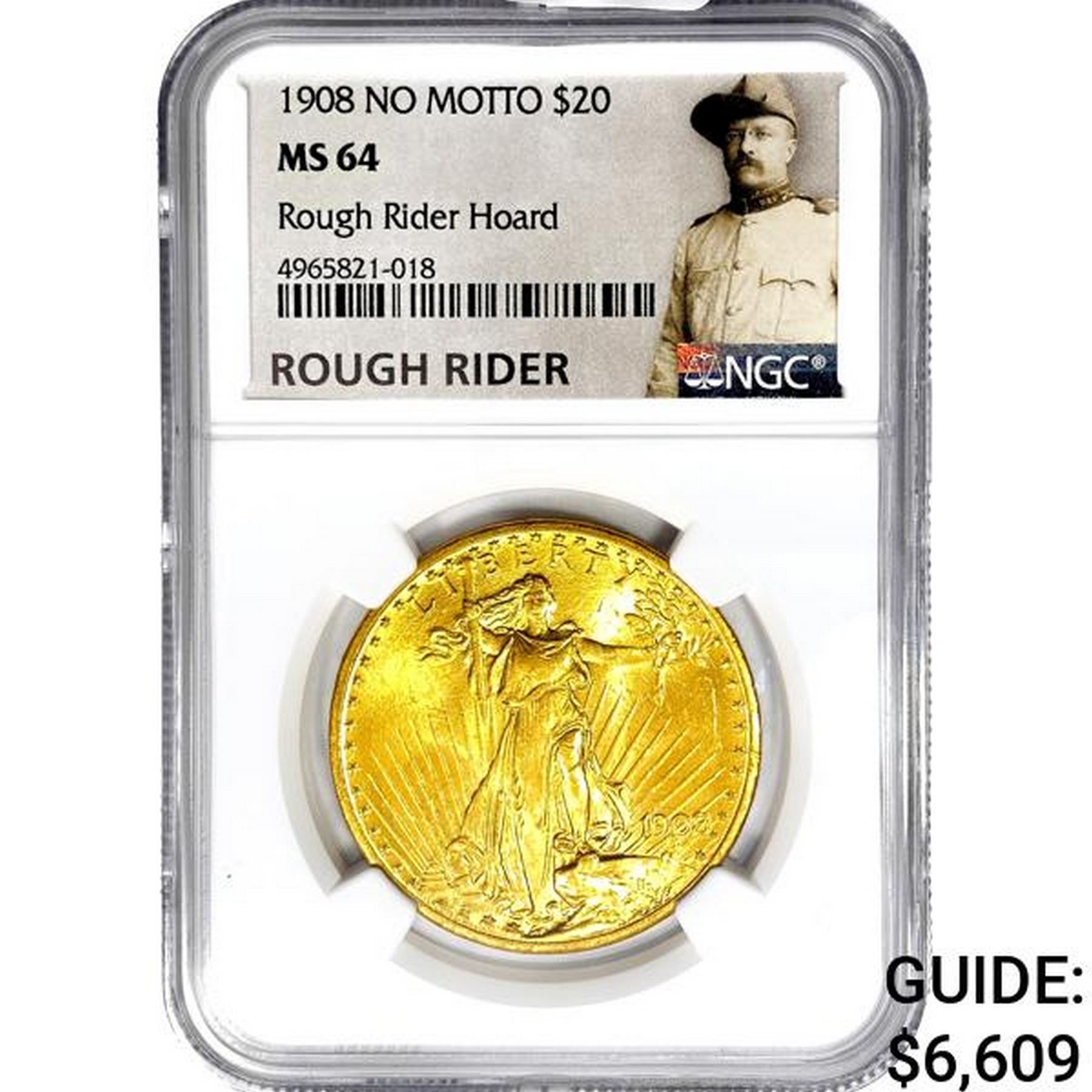 1908 No Motto $20 Gold Double Eagle NGC MS64 Rough