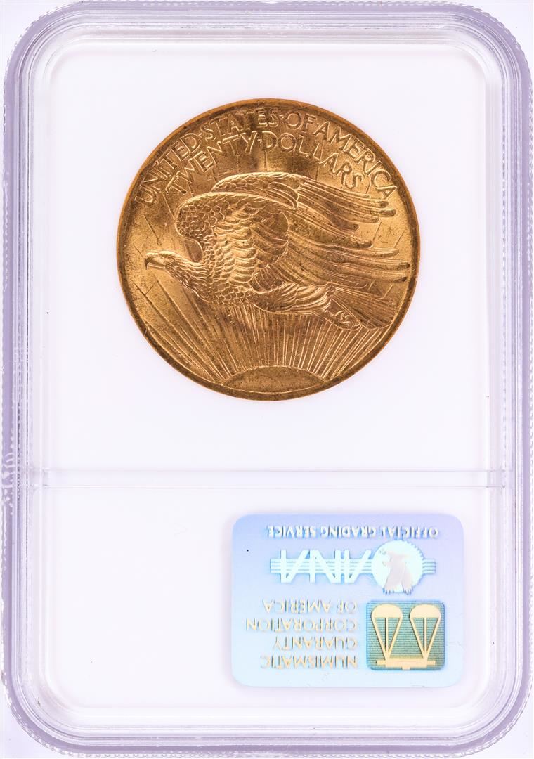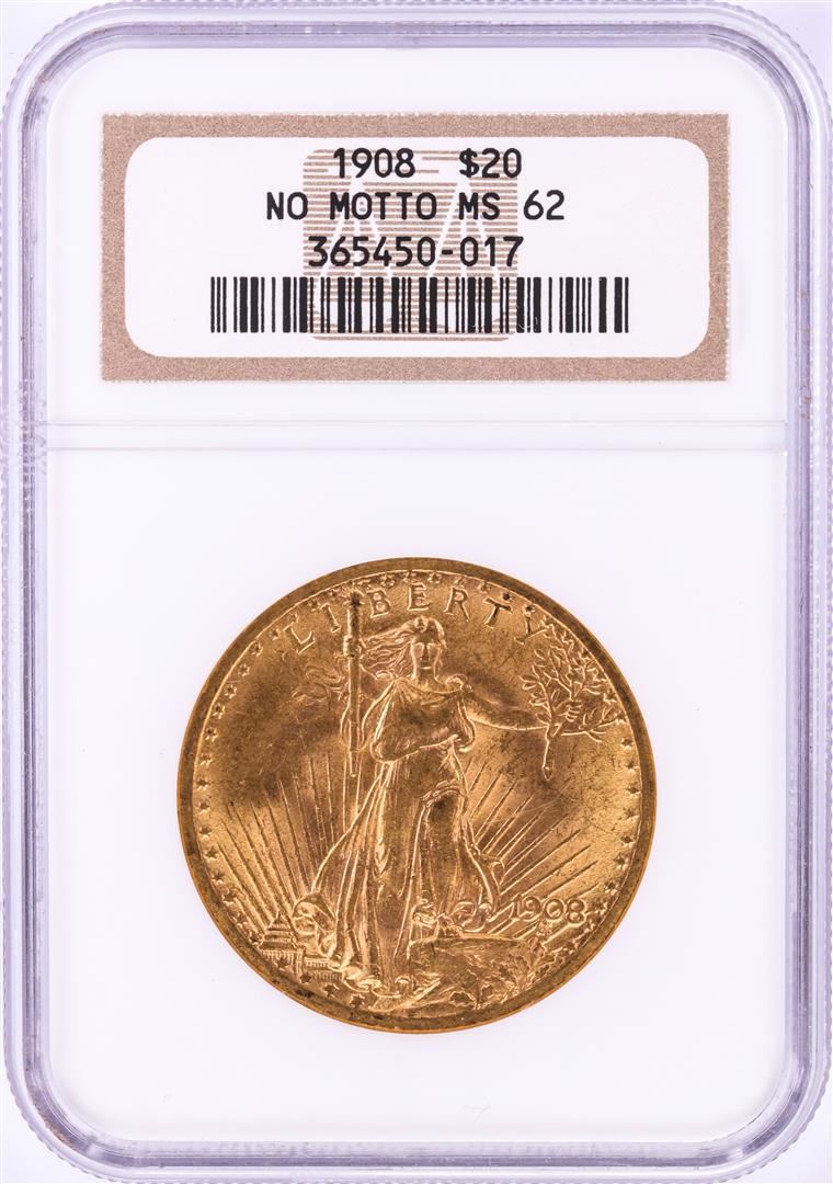 One 1908 No Motto $20 St. Gaudens Double Eagle Gold Coin NGC MS62. NGC Certified.