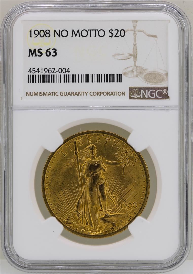 One 1908 No Motto $20 St. Gaudens Double Eagle Gold Coin NGC MS63. NGC Certified.
