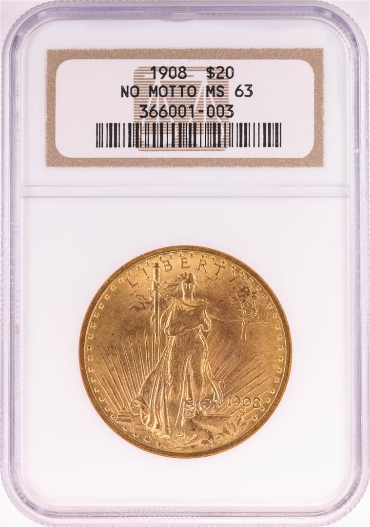 One 1908 No Motto $20 St. Gaudens Double Eagle Gold Coin NGC MS63. NGC Certified.