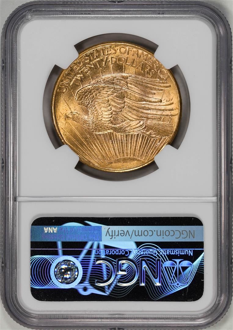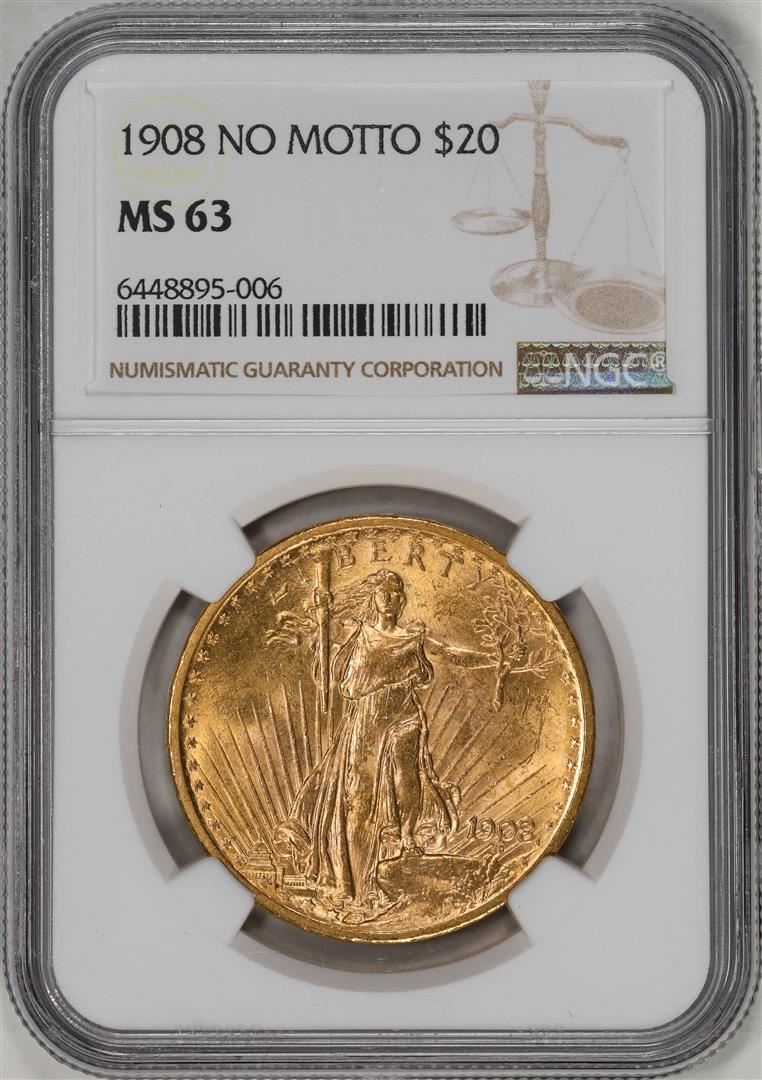 One 1908 No Motto $20 St. Gaudens Double Eagle Gold Coin NGC MS63. NGC Certified.