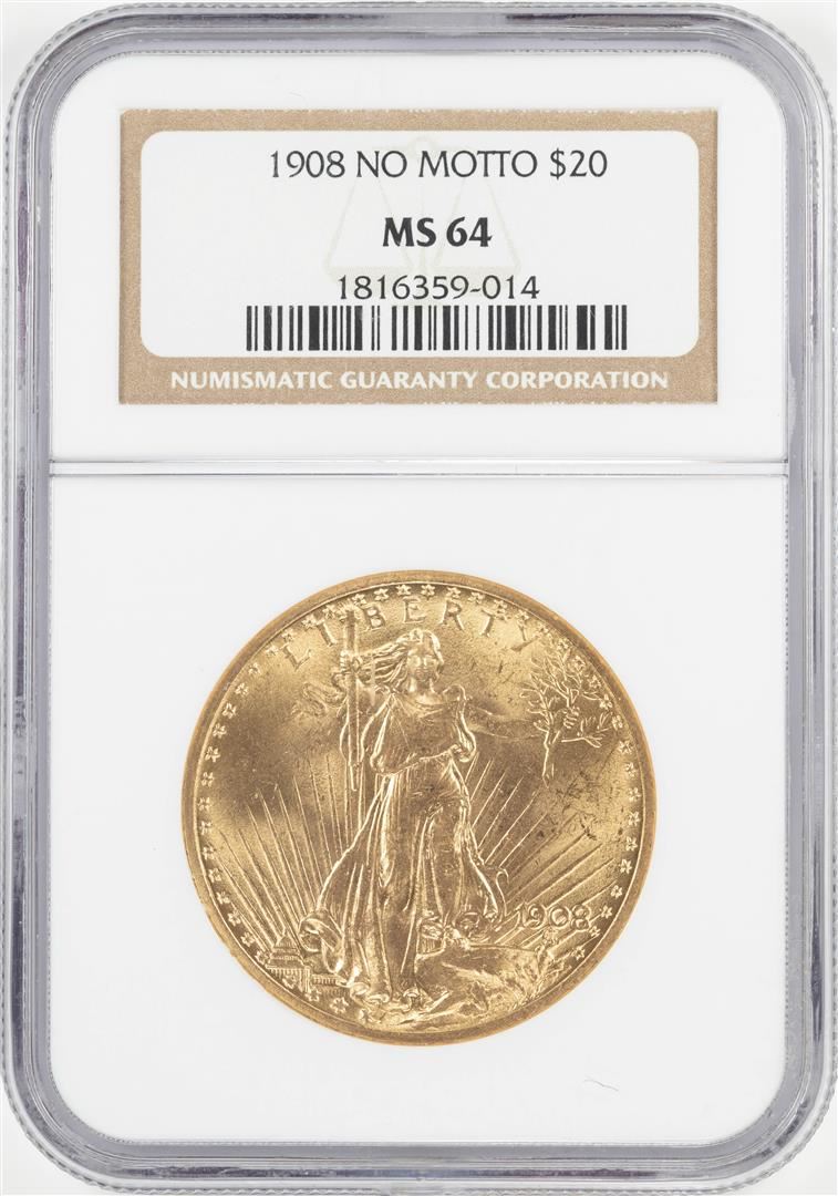 One 1908 No Motto $20 St. Gaudens Double Eagle Gold Coin NGC MS64. NGC Certified.