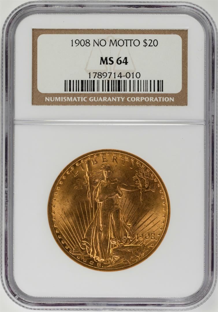One 1908 No Motto $20 St. Gaudens Double Eagle Gold Coin NGC MS64. NGC Certified.