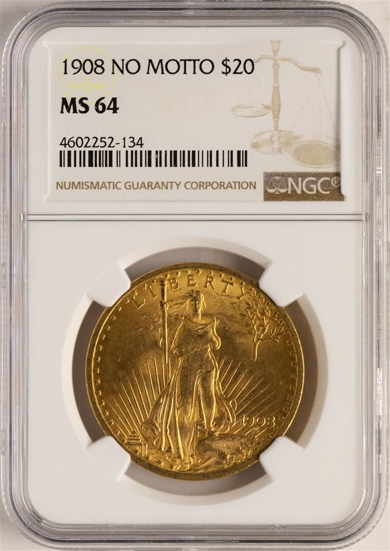 One 1908 No Motto $20 St. Gaudens Double Eagle Gold Coin NGC MS64. NGC Certified.