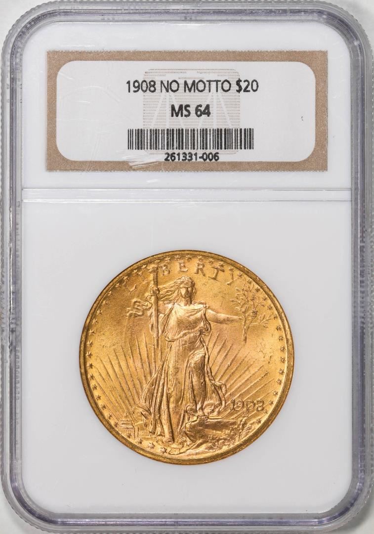 One 1908 No Motto $20 St. Gaudens Double Eagle Gold Coin NGC MS64. NGC Certified.