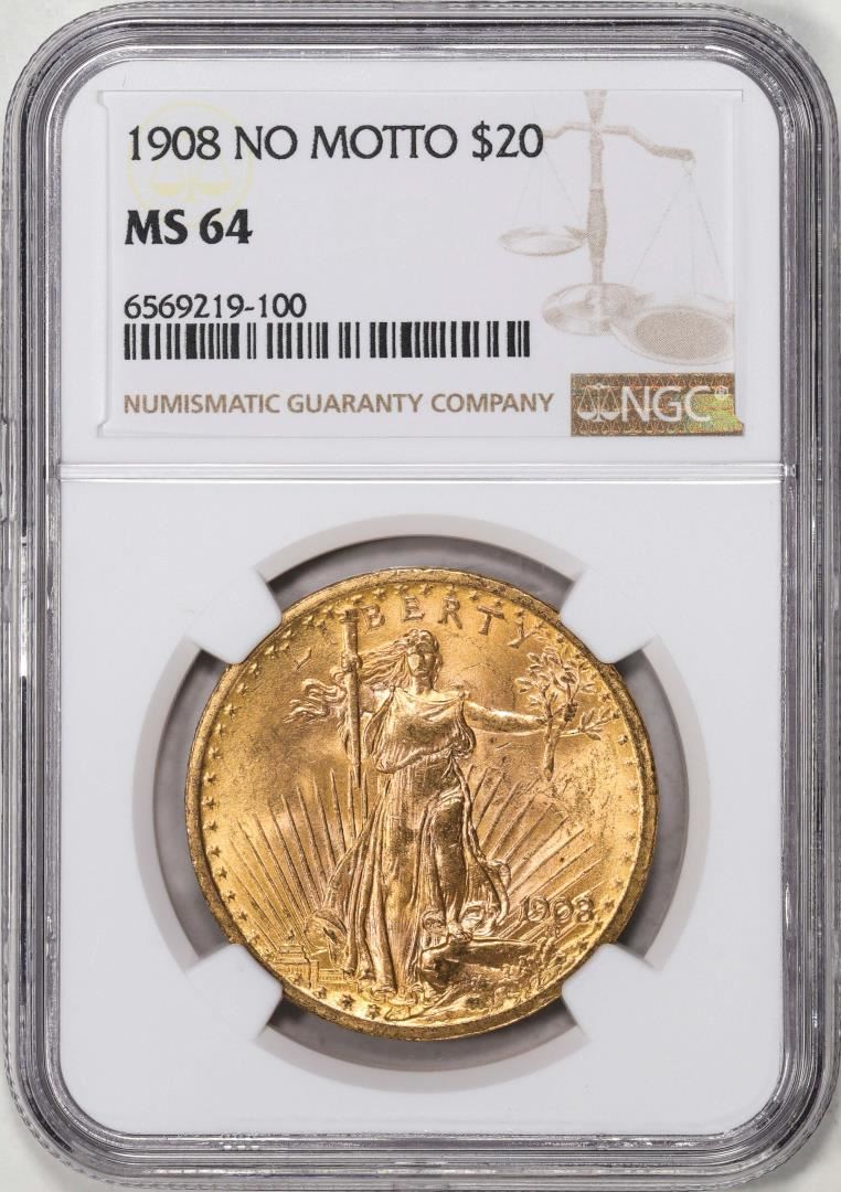 One 1908 No Motto $20 St. Gaudens Double Eagle Gold Coin NGC MS64. NGC Certified.
