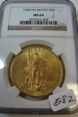 1908 No Motto $20 St. Gaudens Gold Coin NGC MS 64
