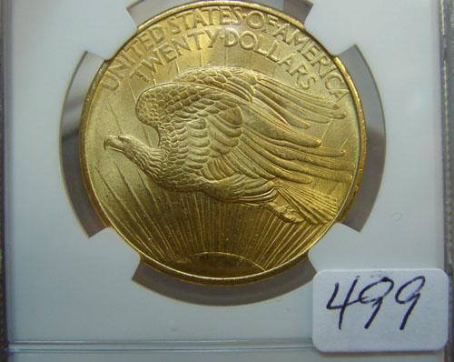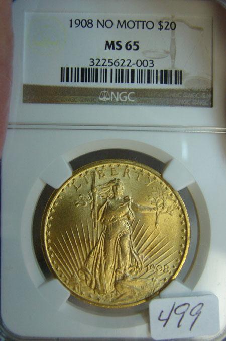 1908 No Motto $20 St. Gaudens Gold Coin NGC MS65