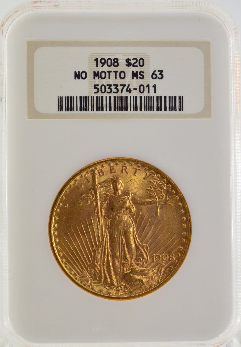 1908 No Motto NGC MS63 Saint Gauden $20 Gold Coin