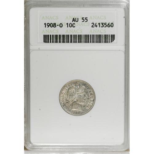 <B>1908-O 10C AU55 ANACS.</B></I> NGC Census: (2/140). PCGS Population (3/86). Mintage: 1,789,000. Numismedia Wsl. Price for NGC/PCGS coin in AU55: $183. (#4848)<BR><BR><b>Shipping:</b> Coins & Currency (<a target="_blank" href="http://www.heritageauctions.com/common/shipping.php">view shipping information</a>)