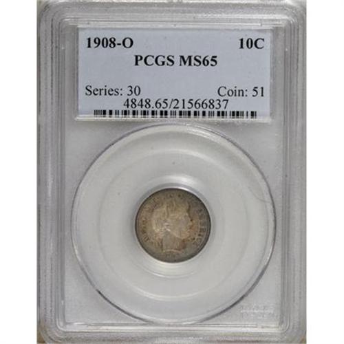 <B>1908-O 10C MS65 PCGS.</B></I> Dusky gold and gray color on the obverse with a mostly brilliant reverse surface ringed by vivid gold and blue color. The obverse has underlying satiny luster and the reverse tends toward frosty luster. A lovely example from the penultimate year of operation for the New Orleans Mint. Population: 23 in 65, 10 finer (5/07).<BR><BR><b>Shipping:</b> Coins & Currency (<a target="_blank" href="http://www.heritageauctions.com/common/shipping.php">view shipping information</a>)