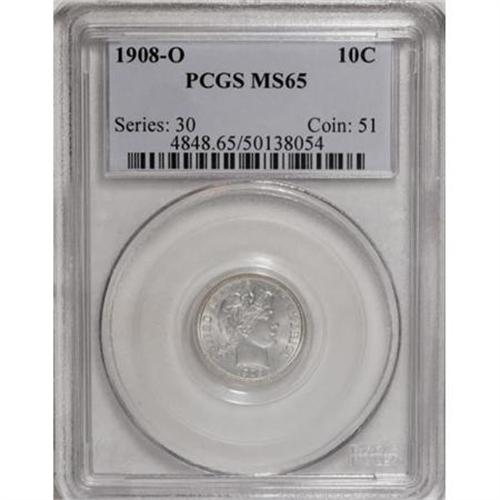 <B>1908-O 10C MS65 PCGS.</B></I> This brilliant Gem has booming luster, and every kernel of grain in the cereal wreath is sharply defined. An exceptional New Orleans dime. The upper loop of the 8 in the date is recut. Population: 42 in 65, 10 finer (1/08).<BR><I>From The Southwest Collection.</B></I><BR><BR><B>Coin Engraver:</B> Charles E. Barber<BR><BR><b>Shipping:</b> Coins & Currency (<a target="_blank" href="http://www.heritageauctions.com/common/shipping.php">view shipping information</a>)