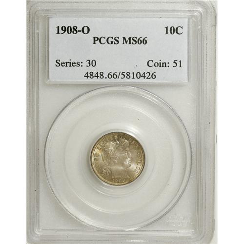<B>1908-O 10C MS66 PCGS.</B></I> This penultimate New Orleans dime issue saw a modest production of under 2 million pieces. The satiny obverse is largely blue-gray with hints of pink and zones of orange at the rims, though the last color intensifies on the reverse and occupies more space. Population: 6 in 66, 4 finer (4/07).<BR><BR><b>Shipping:</b> Coins & Currency (<a target="_blank" href="http://www.heritageauctions.com/common/shipping.php">view shipping information</a>)