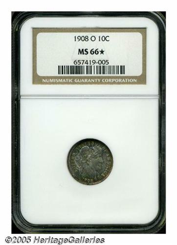 <B>1908-O<10C> MS66 <S NGC.</B></I> Golden-brown and olive colors encircle the untoned centers of this lustrous and exquisitely struck penultimate New Orleans Dime. Population: 1 in 66 <S, none finer with a star designation (5/05).