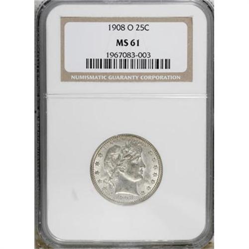 <B>1908-O 25C MS61 NGC.</B></I> NGC Census: (8/147). PCGS Population (8/180). Mintage: 6,244,000. Numismedia Wsl. Price for NGC/PCGS coin in MS61: $183. (#5651)<BR><BR><B>Coin Engraver:</B> Charles E. Barber<BR><BR><b>Shipping:</b> Coins & Currency (<a target="_blank" href="http://www.heritageauctions.com/common/shipping.php">view shipping information</a>)