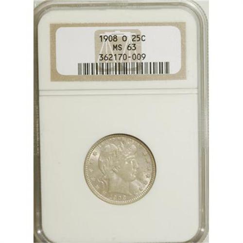 <B>1908-O 25C MS63 NGC.</B></I> NGC Census: (39/89). PCGS Population (58/88). Mintage: 6,244,000. Numismedia Wsl. Price for NGC/PCGS coin in MS63: $320. (#5651)<BR><BR><B>Coin Engraver:</B> Charles E. Barber<BR><BR><b>Shipping:</b> Coins & Currency (<a target="_blank" href="http://www.heritageauctions.com/common/shipping.php">view shipping information</a>\)