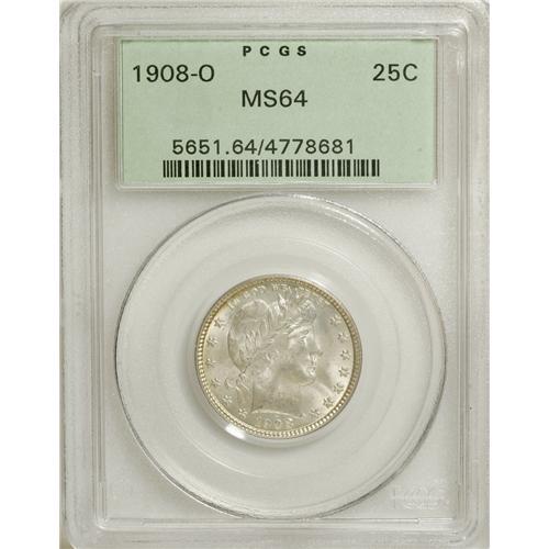 <B>1908-O 25C MS64 PCGS.</B></I> This frosty late-date O-mint near-Gem exhibits pleasing definition and lovely aqua and citrine patina. Highly appealing and housed in a green label holder. Population: 50 in 64, 35 finer (4/07).<BR><BR><b>Shipping:</b> Coins & Currency (<a target="_blank" href="http://www.heritageauctions.com/common/shipping.php">view shipping information</a>)
