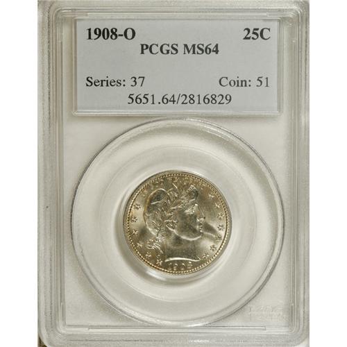 <B>1908-O 25C MS64 PCGS.</B></I> This pleasing near-Gem has a precise strike and delicate peripheral autumn-brown toning. The reverse is exceptionally clean. Population: 50 in 64, 36 finer (2/07).<BR><BR><b>Shipping:</b> Coins & Currency (<a target="_blank" href="http://www.heritageauctions.com/common/shipping.php">view shipping information</a>)