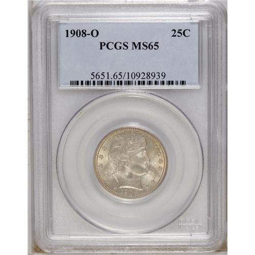<B>1908-O 25C MS65 PCGS.</B></I> A suitably struck and highly lustrous Gem from the waning years of the New Orleans Mint. Largely untoned, though a patch of olive-gold appears in the left reverse field. Population: 27 in 65, 9 finer (12/06).<BR><BR><b>Shipping:</b> Coin/Currency (<a target="_blank" href="http://www.heritageauctions.com/common/shipping.php">view shipping information</a>)