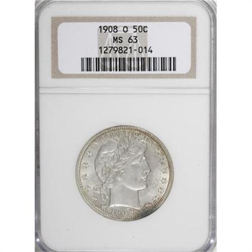 <B>1908-O 50C MS63 NGC.</B></I> A lovely Select coin from the penultimate year of operation for the New Orleans Mint, softly lustrous with splashes of gold and sage patina at the margins. Well struck and pleasing.<BR><BR><B>Coin Engraver:</B> Charles E. Barber<BR><BR><b>Shipping:</b> Coins & Currency (<a target="_blank" href="http://www.heritageauctions.com/common/shipping.php">view shipping information</a>)
