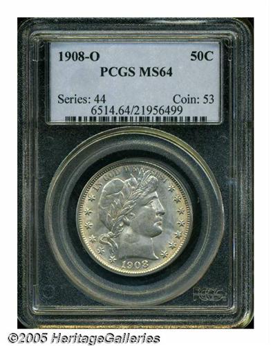 <B>1908-O<50C> MS64 PCGS.</B></I> This is a very pleasing example of this date. Both sides display a satiny, unbroken sheen, light natural toning, and a surprising amount of luster and eye appeal for the issue. An important opportunity for the Barber Half Dollar collector.
