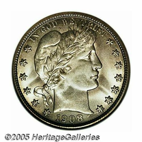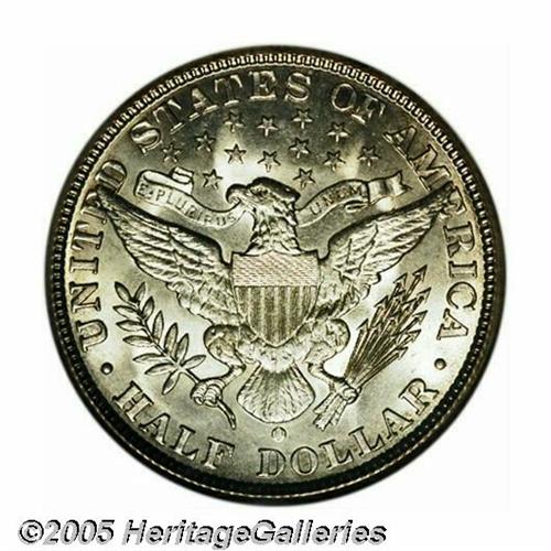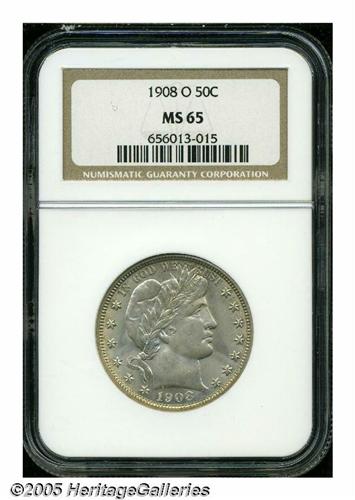 <B>1908-O<50C> MS65 NGC.</B></I> Lightly toned overall with fresh, creamy luster, and smooth surfaces that reveal a minimum of contact marks. A remarkably well preserved, well struck, high grade specimen worthy of a fine collection. Population: 41 in 65, 12 finer (5/05).