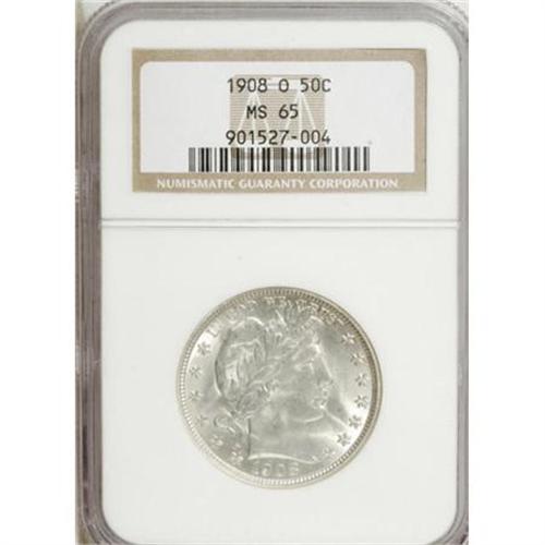 <B>1908-O 50C MS65 NGC.</B></I> Touches of pink-champagne patina are noted on the reverse of this otherwise frosty silver Gem. This is a "mumps" example of the issue, like many encountered. For an O-mint, however, the strike is wonderfully bold, with only trivial reverse weakness. For the collector seeking a sharply struck Gem, this piece should be high on the list. Census: 39 in 65, 15 finer (1/08).<BR><I>From The Southwest Collection.</B></I><BR><BR><B>Coin Engraver:</B> Charles E. Barber<BR><BR><b>Shipping:</b> Coins & Currency (<a target="_blank" href="http://www.heritageauctions.com/common/shipping.php">view shipping information</a>)