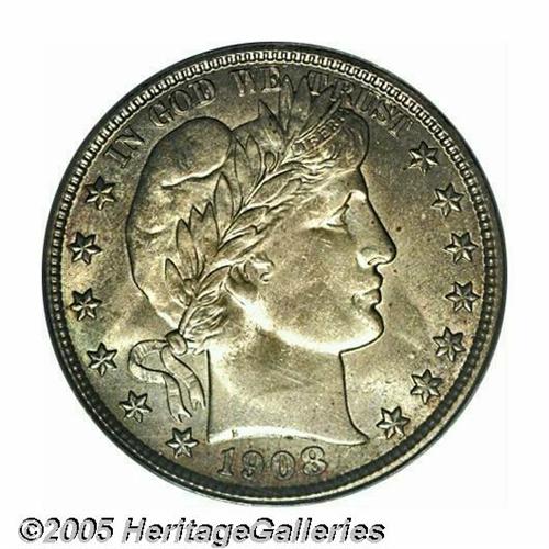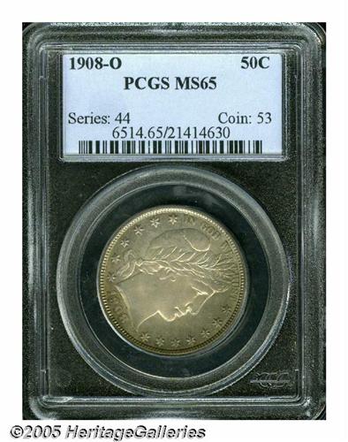 <B>1908-O<50C> MS65 PCGS.</B></I> Certain of the New Orleans Mint Barber Half Dollars are among the more plentiful coins of the series, including the present issue. In fact, there is only one issue (1899) with a higher mintage. The availability of Gem quality examples is still quite limited, and the opportunity to bid on one is not to be missed. This lovely Gem has medium gold and iridescent toning on the obverse with lighter gold on the reverse. The surfaces are outstanding with frosty luster. A delightful example for the connoisseur. Population: 29 in 65, 26 finer (5/05).