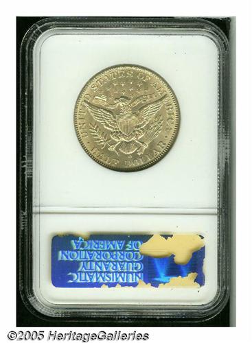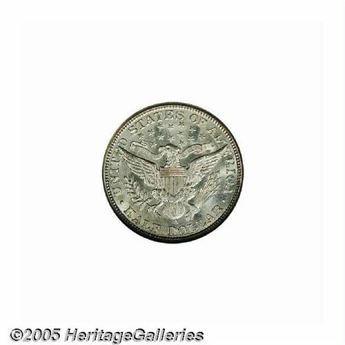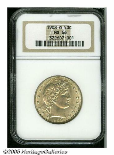 <B>1908-O<50C> MS66 NGC.</B></I> Light toning shows on the obverse and reverse of this lovely high grade example. A combination of creamy luster and smooth surfaces reveal essentially no visible contact marks. Gem examples of this New Orleans issue are occasionally available, but any Barber Half Dollar at this lofty level draws considerable attention. Population: 5 in 66, 5 finer (9/04).