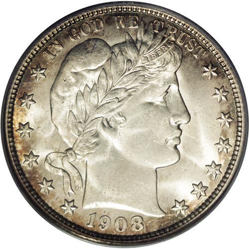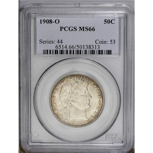 <B>1908-O<50C> MS66 PCGS.</B></I> Light toning on the obverse with a slightly deeper reverse. A lovely high grade example that combines creamy luster and smooth surfaces that reveal a minimum of contact marks. Premium examples of this New Orleans issue are occasionally available, but any Barber half dollar at this lofty level draws considerable attention. Population: 15 in 66, 11 finer (3/06). <BR><BR><B>Important notice:</B> Heritage usually auctions material at the rate of 200-250 lots per hour. On some occasions eBay Live bid software or the Internet may not be able to keep up with the pace of the auction. We recommend placing a realistic absentee bid now as insurance to avoid disappointment. Occasionally the auctioneer may eliminate or reject an eBay Live bid, and the auctioneer may also reopen a lot after the close of the eBay live bidding (usually because we missed an audience bid), and may reject your bid even if it shows you as the winning bidder. By bidding via eBay Live, you agree that Heritage may award the lot to another bidder at its sole discretion under the circumstances described above or any other reasonable circumstances. Since eBay bids are not shown to us until we open the lot on the floor, we treat those bids just like floor bids. In most cases the floor responds before the eBay bid is presented to us, due to Internet lag time, so for consistency we have made it a policy that floor bids are always considered first over tie eBay live bids. Also please note that all Heritage lots purchased through eBay Live carry a 20% Buyer's Premium. Please make sure you read the Terms and Conditions before you bid. This lot is being auctioned in conjunction with a live floor auction by Heritage Galleries & Auctioneers. All final auction and invoice information will be supplied by Heritage Galleries & Auctioneers, and all other information should be considered preliminary. Lot:2071 <BR><BR><B>Winning Notification and Billing:</B> After the FINAL session in this auction is complete, Heritage will send e-mail and snail mail invoices. This process normally takes several days. All final auction and invoice information will be supplied by Heritage Galleries & Auctioneers, and all other information should be considered preliminary. <BR><BR>This auction will be conducted on a live auction floor and over the Internet through eBay Live. If you choose to place an absentee bid, please take a moment to <font color='#0000ff'><u><a href='http://pages.ebay.com/liveauctions/help/before/laabsentee.html'>learn how eBay Live absentee bidding works</a></u></font><font color='#000000'>
