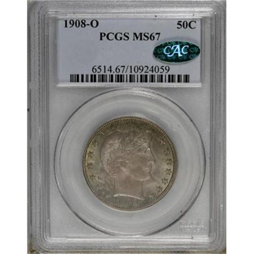 <B>1908-O 50C MS67 PCGS. CAC.</B></I> Radiant luster cascades from each side of this beautiful Superb Gem, which boasts lightly toned greenish-gold surfaces, with the reverse adding a swatch of fuchsia through the center. The strike is extremely sharp for an O-mint Barber half, just a hair short of full, and this piece is one of a dozen so certified at PCGS, with none finer at that service (1/08).<BR><BR><B>Coin Engraver:</B> Charles E. Barber<BR><BR><b>Shipping:</b> Coins & Currency (<a target="_blank" href="http://www.heritageauctions.com/common/shipping.php">view shipping information</a>)