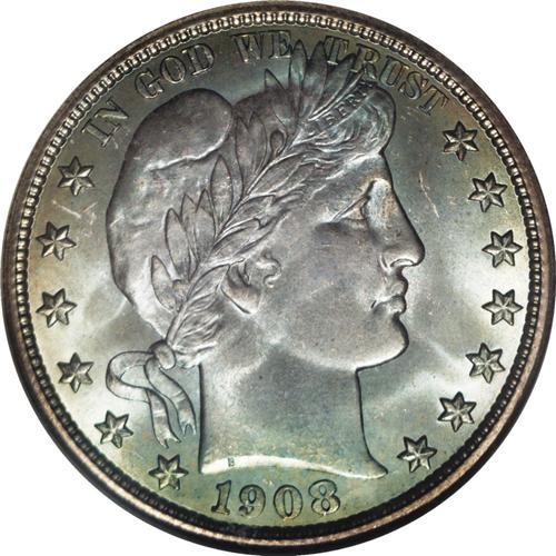 <B>1908-O 50C MS68 NGC.</B></I> Fully toned in waves of sea-green and apricot colors, this lovely O-mint Barber half dollar displays dazzling luster and possesses incomparable eye appeal. A good strike for the New Orleans Mint, since only the right shield corner, the nearby feathers, and the fletchings exhibit incompleteness of detail. 1908 was the last full year of production at the New Orleans facility, whose fate was sealed by a combination of two factors. Silver dollar production ceased in 1904, and a more modern branch mint opened at Denver in 1906. As is the case with so many Barber half issues, the 1908-O is available in average circulated condition, but is difficult to find in VF and finer grades. Mint State pieces can be acquired for a price, but the opportunity of a condition census piece seldom arrives. According to the consignor, the present Superb Gem was part of the Emerson Gaylord collection. Major gold coins from the Gaylord collection were auctioned by Mayflower in Boston on May 18, 1963, but this beautiful Barber half was retained by the family until recently. Tied for the honor of finest certified with one other MS68 graded by NGC, which appeared in our 2005 FUN auction as part of the incomparable John C. Hugon collection of Barber coinage.