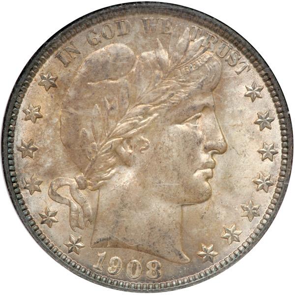 1908-O Barber Half Dollar. NGC graded MS-65. Well struck with lovely delicate pale violet toning on both sides. Typical of the Barber O-mint issues in this high quality, fully original with warm silvery radiance shining through. With such gorgeous luster, it confirms the grade that the coin is struck carefully by the dies. Pop 39; 9 in 66, 4 in 67, 2 in 68.