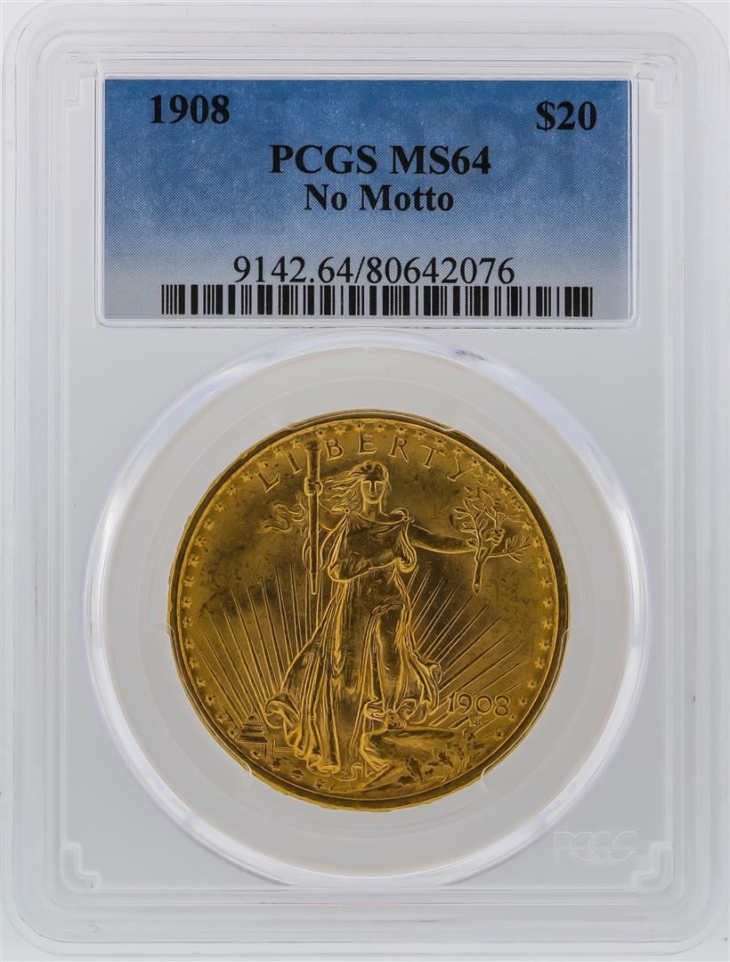 One 1908 PCGS MS64 $20 No Motto St. Gaudens Double Eagle Gold Coin. PCGS Certified.