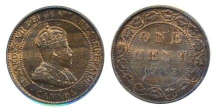 1908. PCGS graded Mint State-64. Red-Brown. 15% red luster.