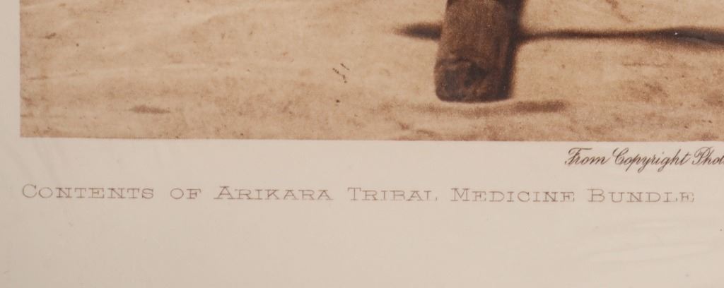 For your consideration is this 1908 photogravure on vellum paper of an Edward Curtis photograph titled, "Contents of Arikara Tribal Medicine Car". The piece has been printed on the correct Japanese Vellum (a calfskin or goat skin) paper. Edward S. Curtis favored three types of handmade papers for his photogravures: Japanese Vellum, Dutch "Van Gelder" and Japanese Tissue (also known as Indian Proof Paper). This piece is marked on the front reading, "From Copyright Photograph 1908 by E. S. Curtis / Contents of Arikara Tribal Medicine Bundle". The photo shows the contents of what would have been in the Arikara tribes medicine bag, including food, herbal medicine, furs and more. The photogravure has been placed on a large piece of parchment paper, set on foam board and plastic wrap to preserve its condition. The visible art measures 5 1/4" L x 8 3/8" W. The entire piece measures 11 3/8" L x 13 1/2" W.