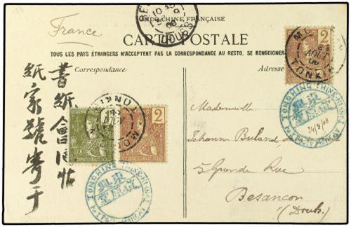 1908 Picture post card from LOFAO near Tonghing (China) cancelled by TONGHING CHINE/P & I POSTE MONCAY TONKIN in blue routed west via Indo-China bearing Indo-China 1 cent olive (Yvert 24) and 2 cents brown (2) (Yvert 25) tied by MONCAY TONKIN double ring routed via Haiphong with BESANCON arrival. The mail was posted in China and cancelled by the Post Local cachet and forwarded via the Indo-China post as the most convenient route to France.