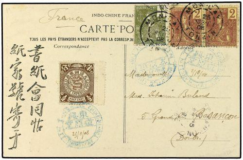 1908 Picture post card from LOFAO near Tonghing bearing Chinese Imperial Post 1/2 cent brown (SG 108) tied by TONGHING CHINE/P & I POSTE MONCAY TONKIN in blue mixed with Indo-China 1 cent olive (Yvert 24) and 2 cents brown (2) (Yvert 25) tied by MONCAY TONKIN double ring routed via Haiphong with BESANCON arrival. The mail was posted in China and paid to the border with the Imperial Chinese Post stamp and Post Local cachet and forwarded via the Indo-China post as the most convenient route to France.