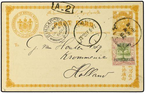 1908 Postal stationary card 1 cent yellow written from LANGKON and upgraded with 3 cent mauve and green (SG 129) tied by KUDAT datestamp, routed via Singapore addressed to HOLLAND with KROMMENIE arrival on front. Superb.
